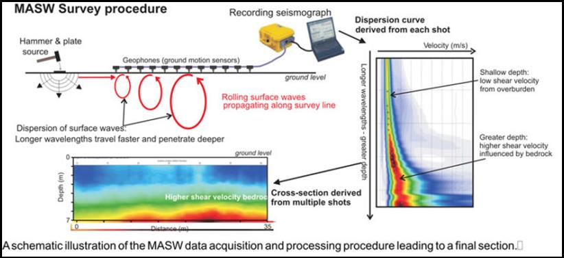 The technique is based on the recording of seismic waves that roll much like a seawav e along the surface and extend down to depth beneath the survey line. At each new location it is essential to carry out initial tests to determine optimum acquisition parameters including geophone spacing and shot offset distances. Typically a hammer and plate or buffalo gun is used as the seismic source with the latter offering more power for difficult sites. Surface waves travel more slowly than other seismic signals and are recorded over long time intervals by comparison. The recorded data are first processed to produce dispersion curves for each shot. These curves are then modelled individually to produce 1D depth profiles of shear wave velocity and then combined to produce a depth cross-section revealing the shear wave velocity structure of the ground. |