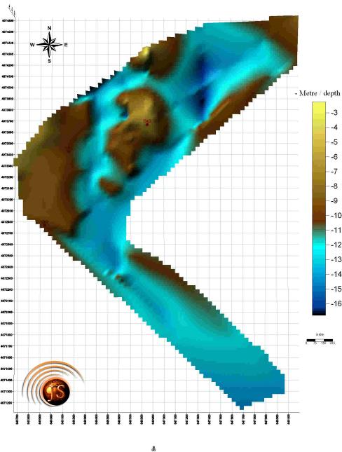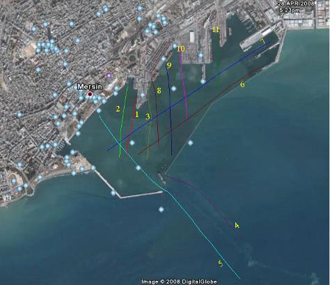Introduction As part of the equipment MERSIN PORT Survey project, Advanced Geosciences, Inc. (AGI) participated with it’s SuperSting Marine, towed Resistivity imaging system. A preparation survey was performed on may 10 and a final survey, of predetermined lines 1-11, was performed on june 20. Figure shows the total available resistivity data from the workshop. This report only treats resistivity data collected along lines 1 – 4 (see Figure 2.) Contact AGI for any other data collected during the workshop. Instrumentation and survey design The survey was undertaken using the AGI SuperSting Marine system and a streamer with 11 electrodes at 10m., 20m.,and 40m. intervals. The SuperSting instrument has 8 receivers and a transmitter, making it possible to record eight readings simultaneously as the current is injected through the two current electrodes. The streamer was towed at the surface of the water in such a way that the electrodes were totally submerged below the surface at all times. The two electrodes nearest the boat were used for current injection and the other nine electrodes were used for potential measurements. An electric current was injected into the water approximately every 3 seconds through the two current electrodes. The resulting eight potential differences, between the following 11 electrodes, were simultaneously measured and recorded. The survey array could be considered a moving dipole-dipole electrode array. A longer streamer with 10,20,40 meters electrode spacing and an expected depth penetration of 20,40,80 meters was available. A GPS receiver was placed on the boat and the SuperSting was time synchronized with the GPS,making it possible to later on, calculate the location of each electrode, assuming that the electrode cable trailed the boat track.