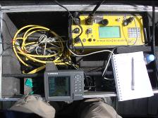 A fathometer was time synchronized with the GPS and used for entering a priori information about water depth during the inversion modeling. The fathometer also had a sensor which records the near surface water temperatures. |