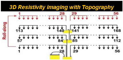 3D survey Use the Switch Box for 3D data recording. Note that the surface electrodes can be combined with borehole electrodes for higher resolution at depth. 3D roll-along can be performed in the north-south direction as well as in the east-west direction. |